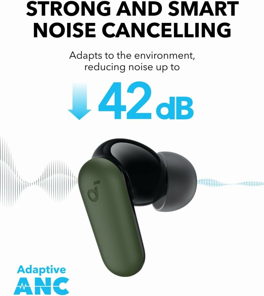 • Strong and Smart Noise Cancelling: Reduce noise by up to 42dB with an advanced active noise cancelling system. With adaptive technology, soundcore R50i NC detects external sound and automatically selects a level of noise cancelling optimized for your ears.