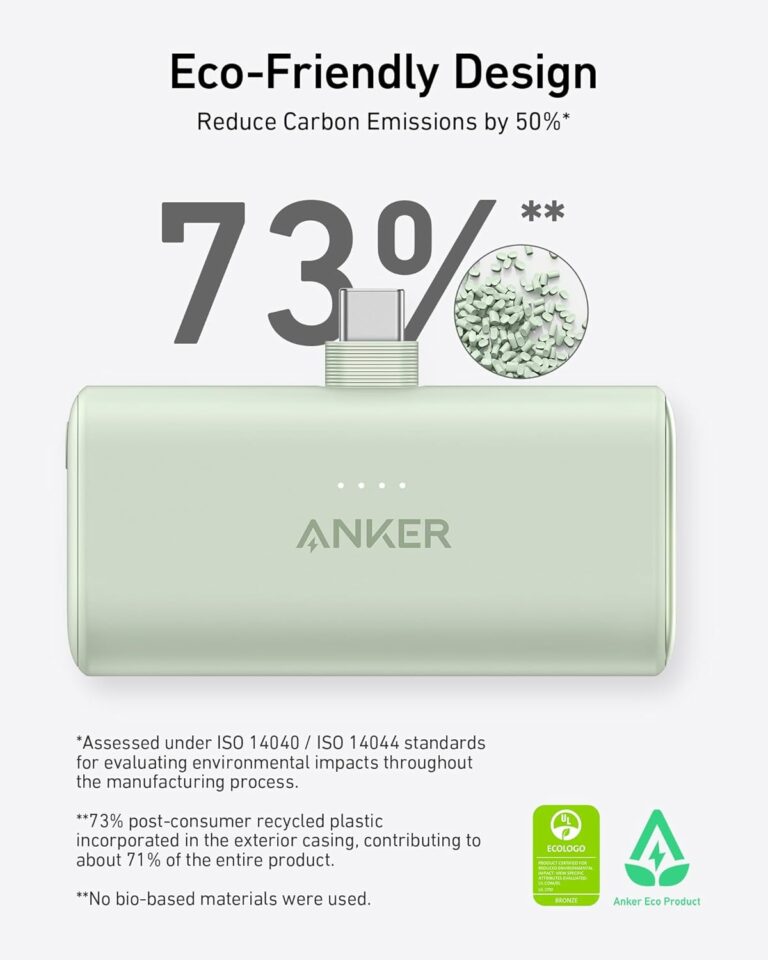 Reduce. Reuse. Recharge:Â The sustainable design features an exterior made from 73% post-consumer recycled (PCR) materials, so you can charge your devices responsibly.