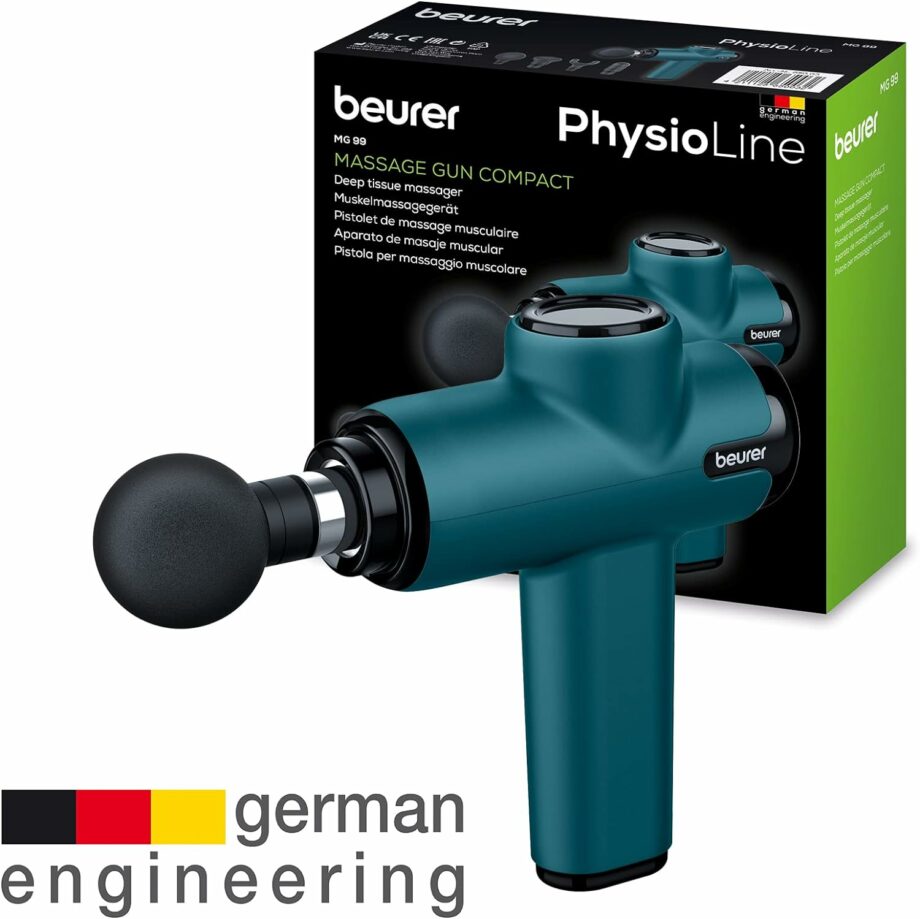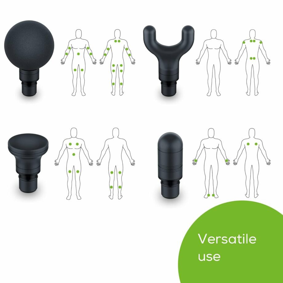 The MG99 Massage Gun from Beurer is the perfect way to benefit from trigger point massage therapy for tense muscles. Thanks to the deep penetration, fasciae adhesions can be targeted and hardened muscles and tissue can be loosened. It’s ideal for both muscle activation before training and regeneration after training. With a weight of only 620g you can take the mini massage gun with you anywhere at any time.