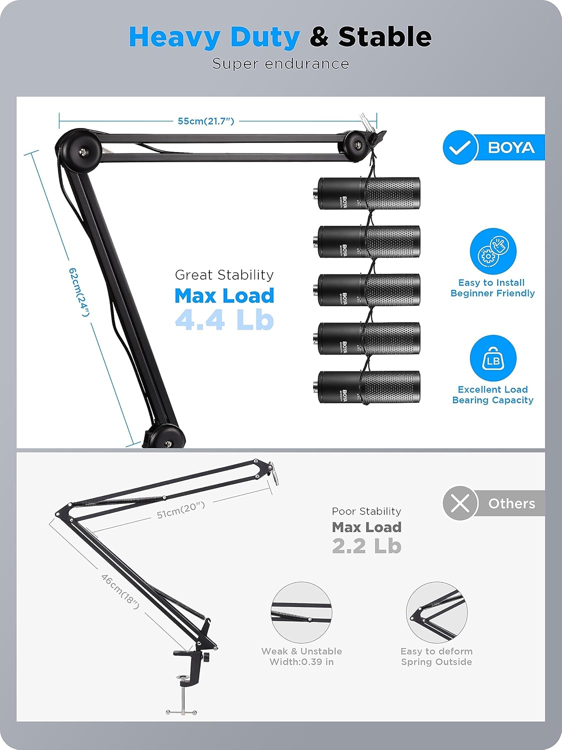 BY-BA20 boom arm is made of high-strength zinc alloy metal, the maximum load can reach 2KG/4.4Lbs.It can effectively prevent the microphone from shaking and rattling during the recording process, and improve the recording clarity.