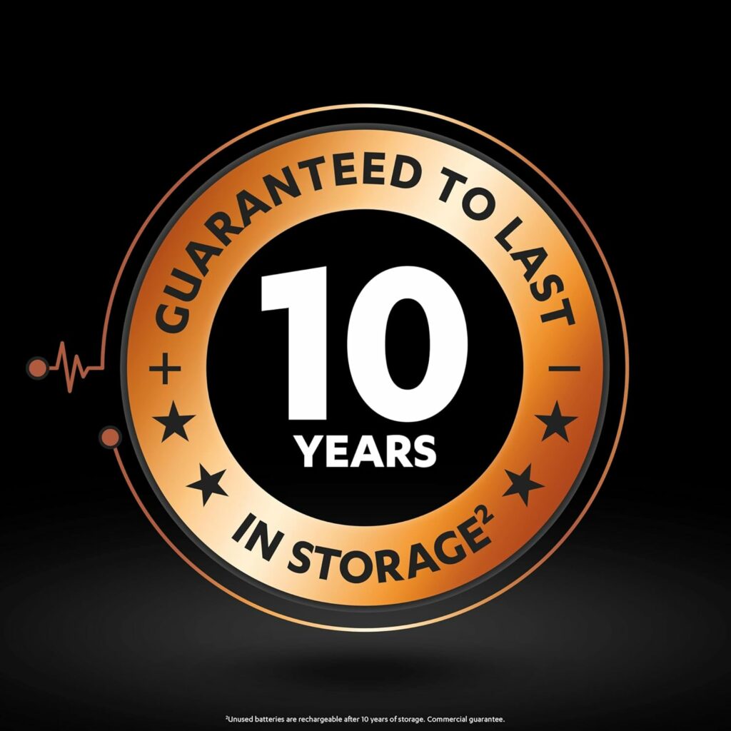 *for rechargeable AA size, per charge in same device, up to first 300 charges,**Unused batteries are rechargeable after 10 years of storage. Commercial guarantee***Retain up to 80 percent of their charge after 12 months when not in use
