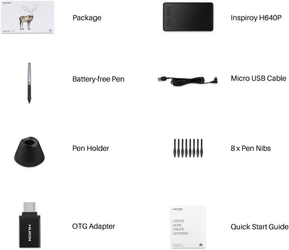 Support Linux/Mac/Windows/Android: Not only compatible with Linux(Ubuntu), Mac and Windows, Huion H640P also supports Android 6.0 or later via an included OTG adapter to turn your phones or tablets into a digital drawing canvas.This easy-to-use pen tablet is perfect for kids and beginners for drawing,animation,photo-editing or design work in most programs including Adobe Photoshop, paint tool sai, illustrator, corel draw, corel painter, sketchbook, manga studio, clip studio paint and more.