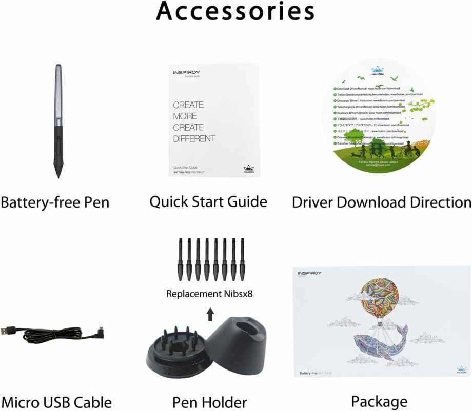 Huion drawing tablet H950P is compatible with a wide range of devices, such as computers, laptops, android phones, and tablets, and it is also compatible with a wide range of systems and almost commercially available software, which can meet most of your needs, such as drawing, distance teaching/learning, note entry, designing, and editing videos, etc.