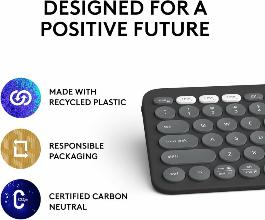 • A Design Choice You’ll Feel Good About: Plastic parts in the Pebble Keys 2 K380s Slim Keyboard include minimum 49% certified post-consumer recycled plastic (1)