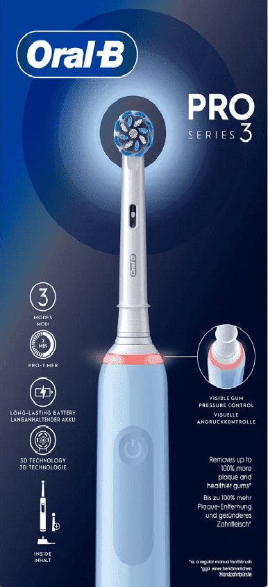 Experience Oral-B Pro Series 3 from the brand used by most dentists in the world. Series 3 electric toothbrush helps you brush your teeth the way your dentist recommends it: It helps you brush for 2 minutes with the professional timer, and every 30 seconds it notifies you to change position and brush a new place. While you just move the brush around in your mouth, Oral-B’s unique round head does the rest. It removes up to 100% more plaque than a regular toothbrush, makes your gums healthier and whitens your smile from the first brush by removing superficial discoloration. And not only that – the toothbrush also helps you protect your delicate gums with 360° pressure control technology that reduces brushing speed and warns you to be gentler if you brush too hard. The Oral-B Pro Series 3 is a must for anyone looking to switch to an electric toothbrush and improve their oral health