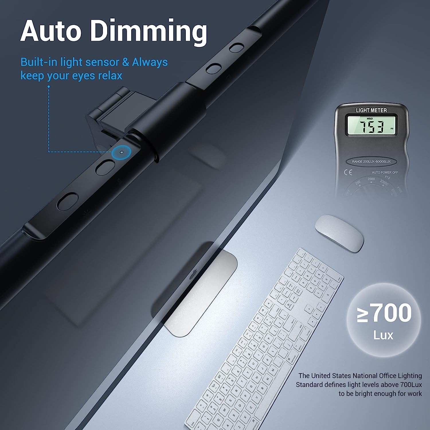 【Auto-Dimming & Manual Stepless Dimming】Built-in ambient light sensor continuously monitors the surrounding brightness and intelligently supplements the existing light to the 700lux. Prevents excessive or insufficient lighting that can visual fatigue, creating an eye-healthy light environment for work and leisure. ScreenLinear Pro monitor lamp can also be manually adjusted for brightness and color temperature (3000K-6500K) to customize preferred lighting to feel most comfortable to your eyes.
