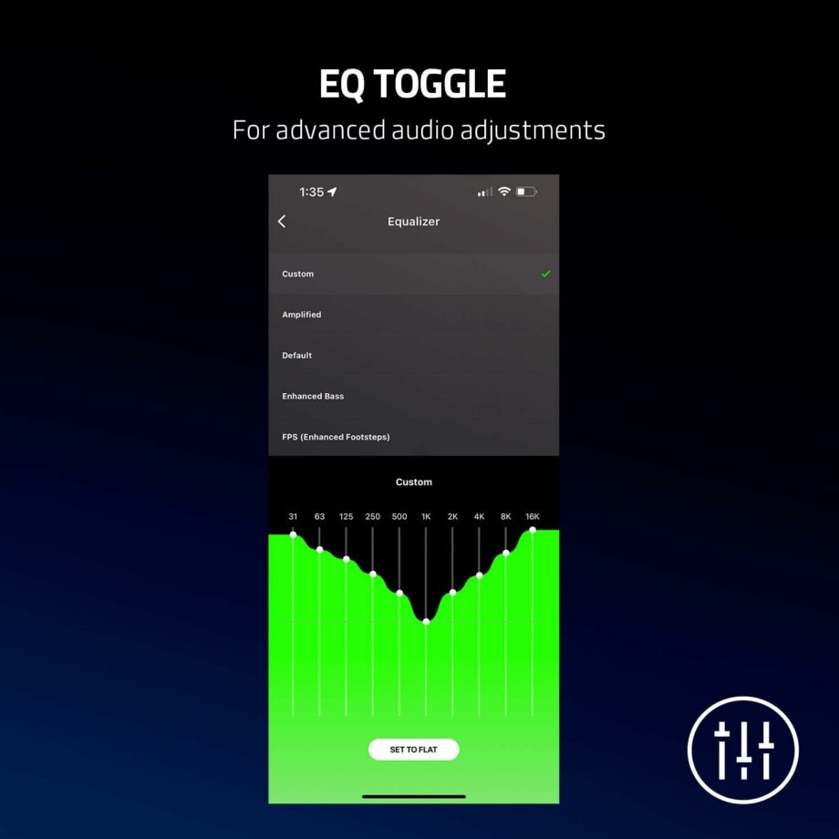EQ Toggle: Create a custom EQ or cycle through 4 presets via the Razer Audio app on Android/iOS, with options such as FPS Mode for a competitive edge, or Bass Mode for more ‘oomph’
