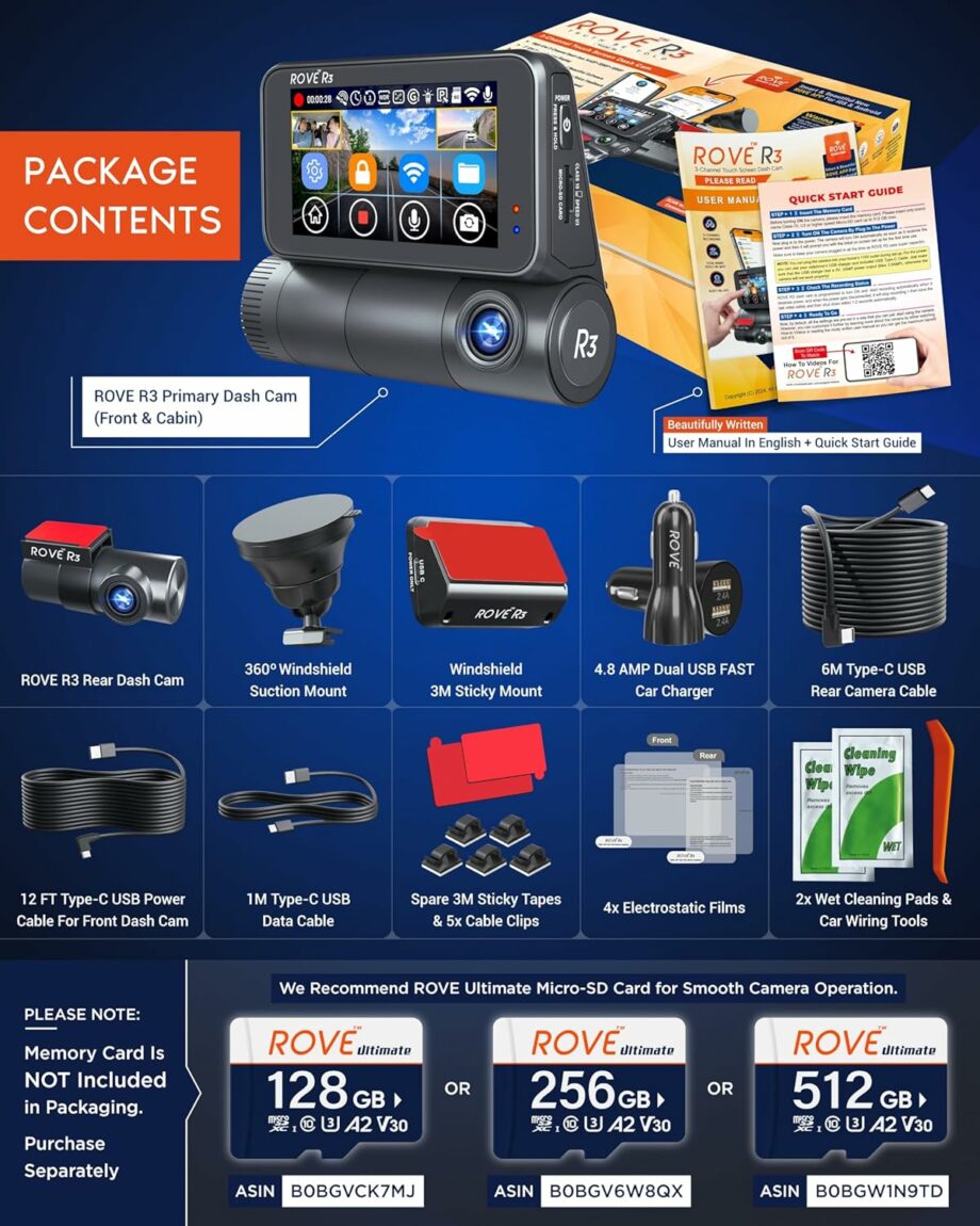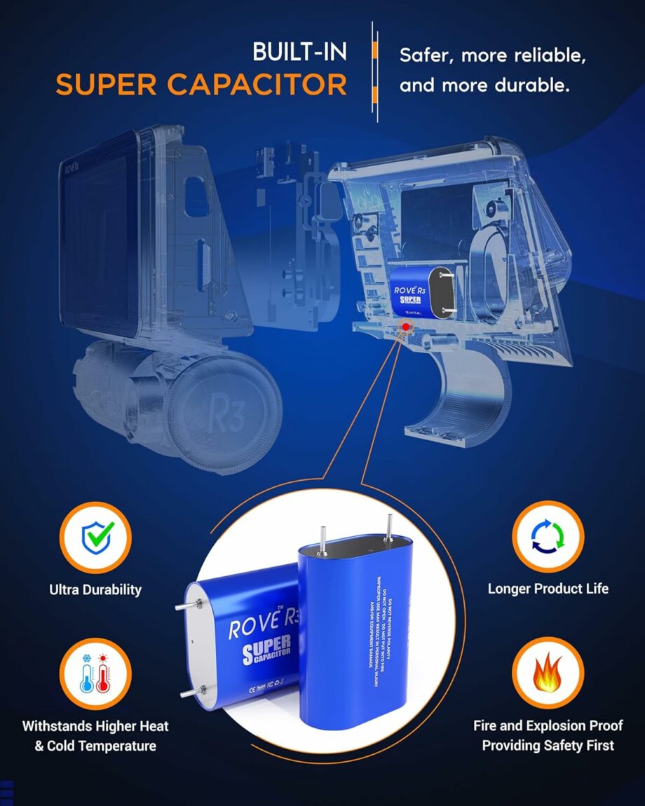 【Let’s talk about all the bells and whistles】Here we go, It’s got 3″ IPS touch screen, 3 channel recording front + cabin + rear, the all-new ROVE APPs for iOS and Android, remote firmware updates, always ON dual-band 5.0 GHz and 2.4 GHz built-in WiFi for super-fast transfer speed, Built-In GPS for live speed, compass, and location stamps, proprietary fail-safe voice guidance, supercapacitor offers safety and longer product life unlike other internal battery dash cams.