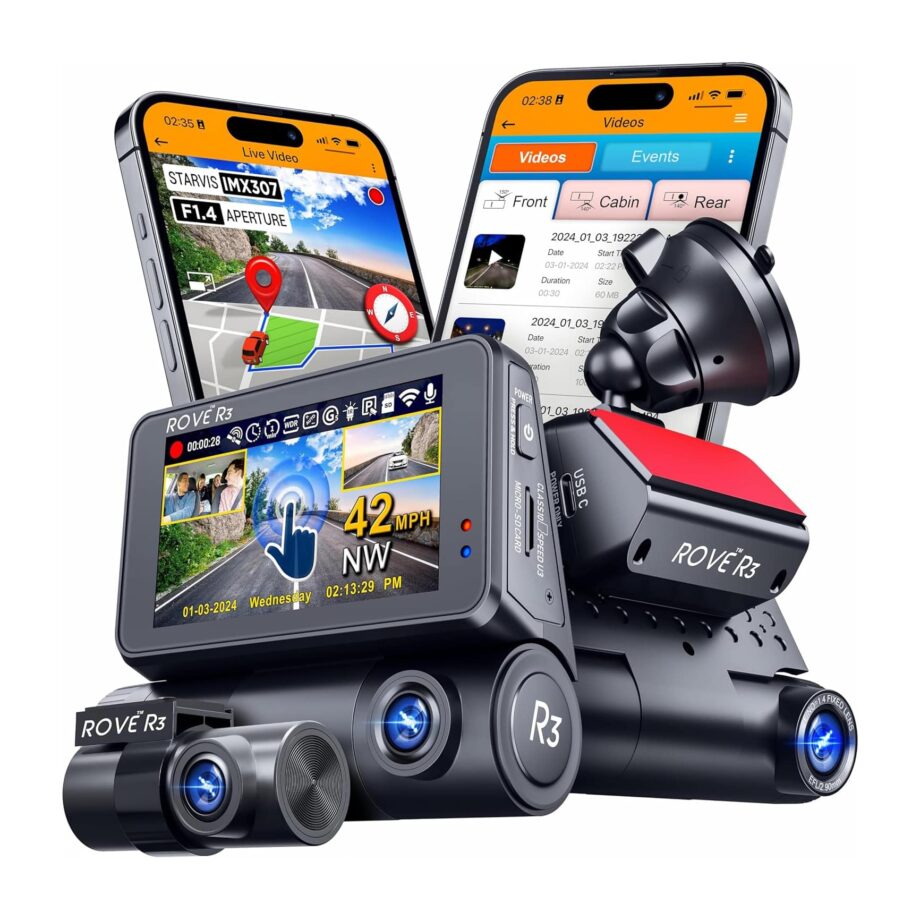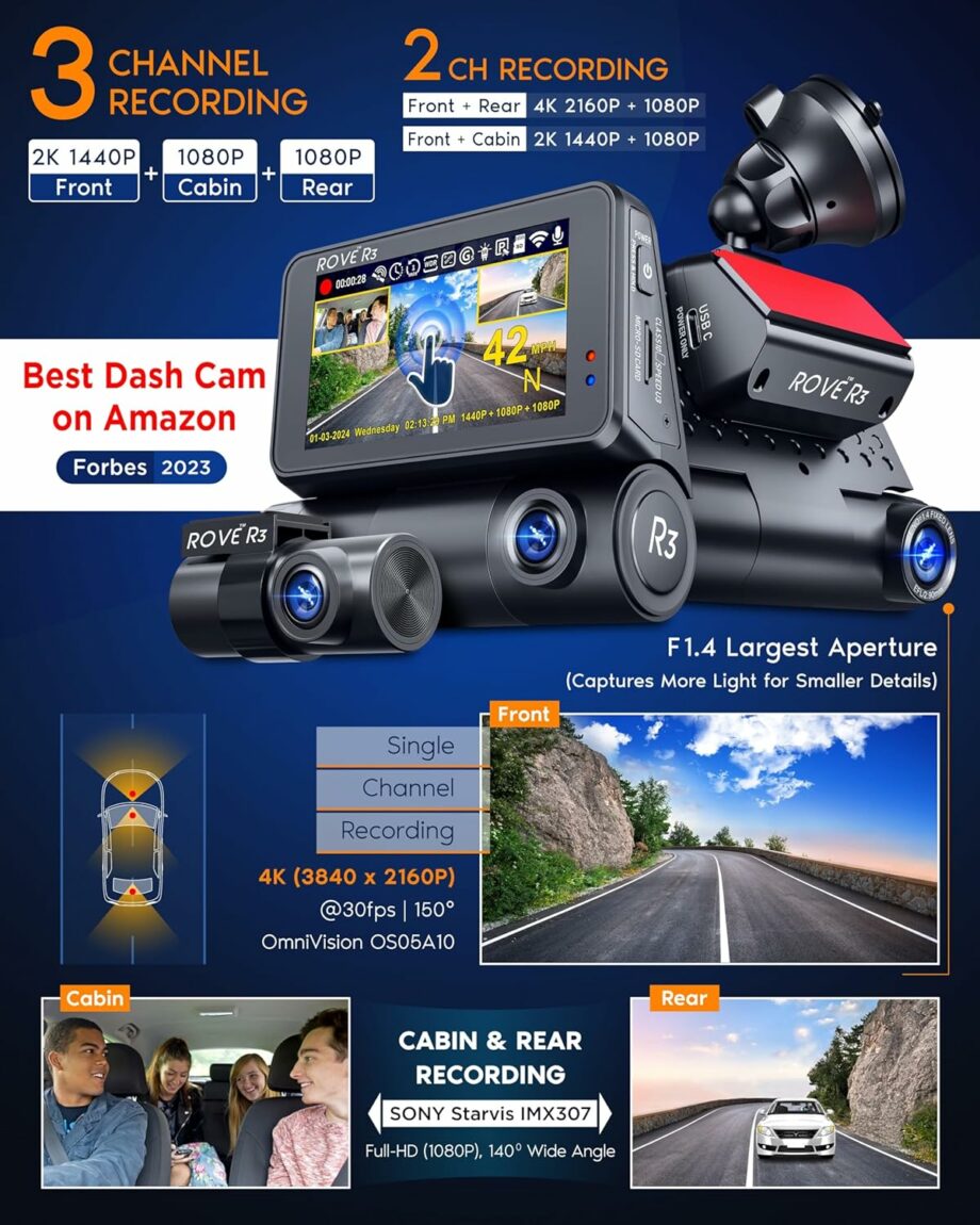 【Experience The Difference with ROVE】ROVE R3 is a 3 channel touch screen dash camera for cars. This is all you need for any dash cam need and enthusiast, period. It has all the bells and whistles with an industry-changing design that features 3 Inch IPS Touch Screen with just a single power button and the rest is done magically by ROVE’s custom-designed firmware of this dash camera.