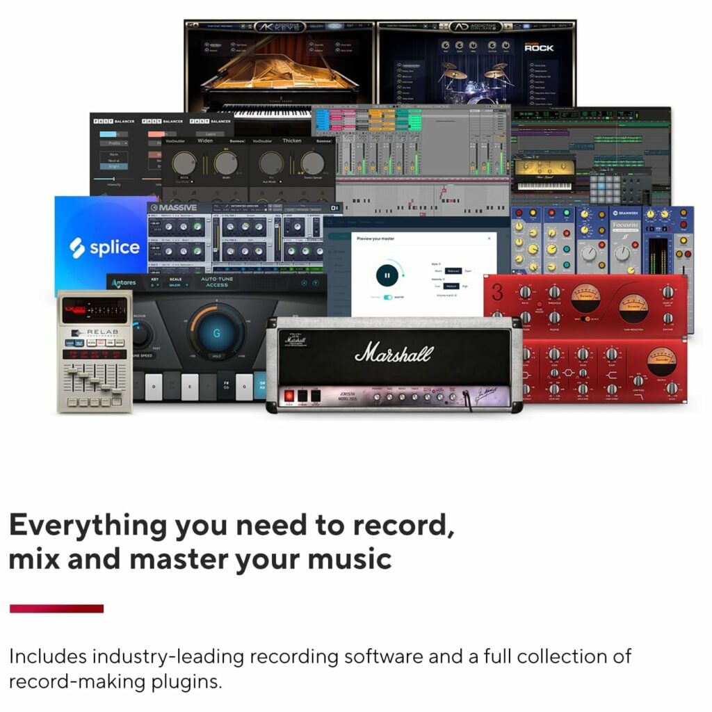 Get started with Pro Tools Artist or Ableton Live Lite recording software. Then explore the Hitmaker Expansion bundle, with an unbeatable range of record-making studio tools from the biggest names in the business. Get exceptional vocal tracks with Antares Auto-Tune Access. And huge guitar tones with Softube’s hyper-realistic model of a Marshall Silver Jubilee. Plus drums, keys, synths, and powerful production tools to get you release-ready results from your very first session.
