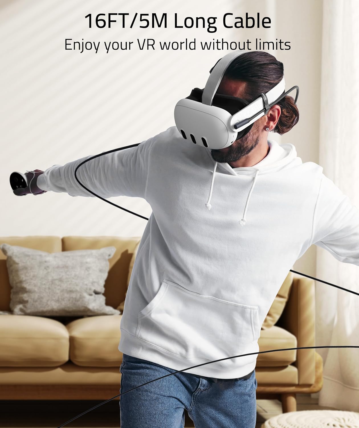 • Flexible and Sturdy: Experience complete freedom of movement with this 16ft long cable that allows you to fully immerse yourself in the VR world without any restrictions. Crafted from highly durable materials, this cable offers exceptional stretch and abrasion resistance, making it a reliable option for long-term use. The upgraded L-shaped Type-C interface ensures a robust and reliable connection, while the cable is reinforced to withstand over 5000 bends without any damage.