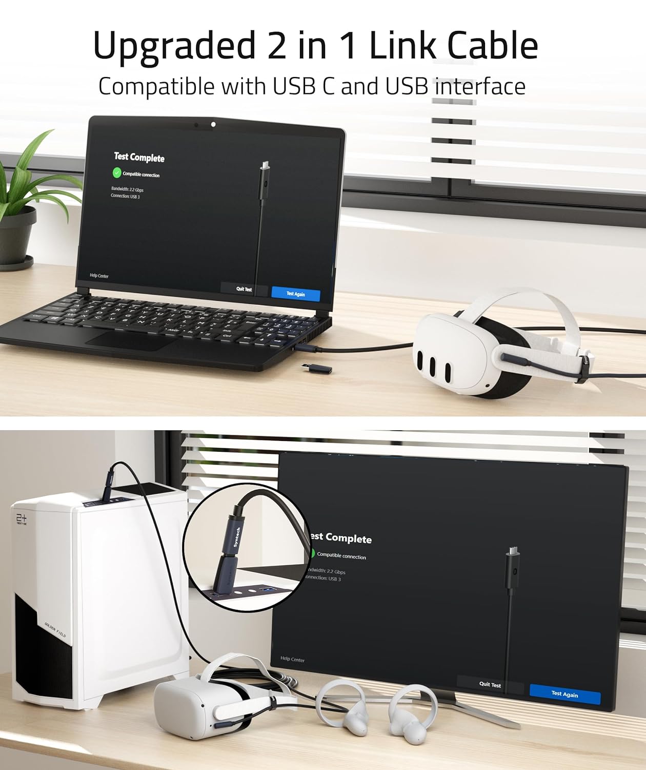 • Upgraded 2-in-1 Link Cable: The Improved USB 3.0 Type-C VR cable maintains high-speed data transmission. The extra USB 3.0 adapter can be used separately to support 5Gbps data transmission and power transmission up to 5V/3A, it can be used for phones, computers, tablets, and other digital devices.