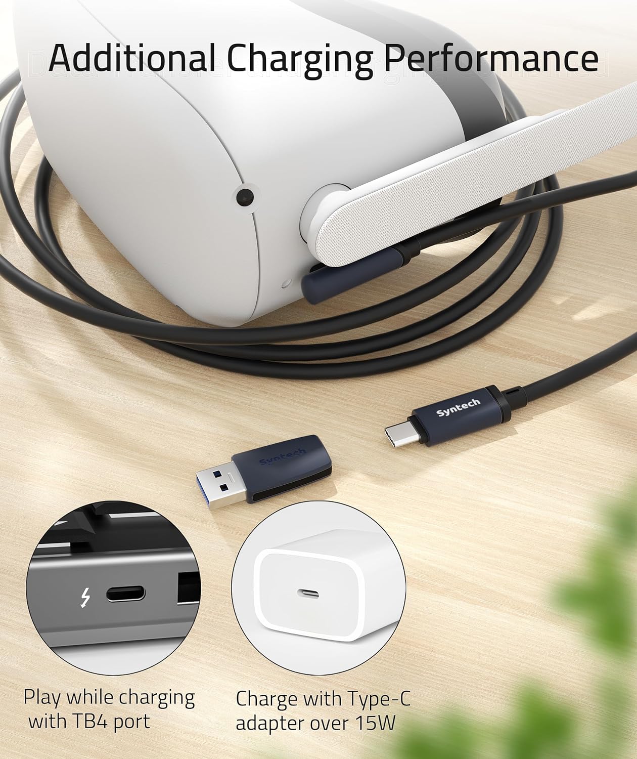 • Compatible with Quest3/Quest2/Vision Pro: Syntech 2-in-1 link cable offers additional interface options for both USB A and Type C ports. It can connect your VR devices to a gaming PC so that you can explore the VR world freely and play all Steam VR games, providing perfect PC VR experience. The color and design of the cable and adapter match perfectly with the Quest3/Quest2 headset. For Vision Pro, using the official 30W adapter to charge is recommended.