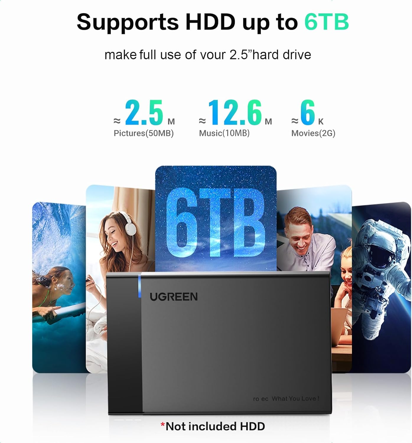 Plug and Play & Universal Compatibility: Plug & Play.It supports Windows, LINUX, MacOS 8.0, and above. Designed for 2.5 inches 7mm /9.5mm SATA HDD & SSD up to 6TB. Compatible with WD, Seagate, Toshiba,Samsung, Crucial, SATA port SSD or HDD, and more