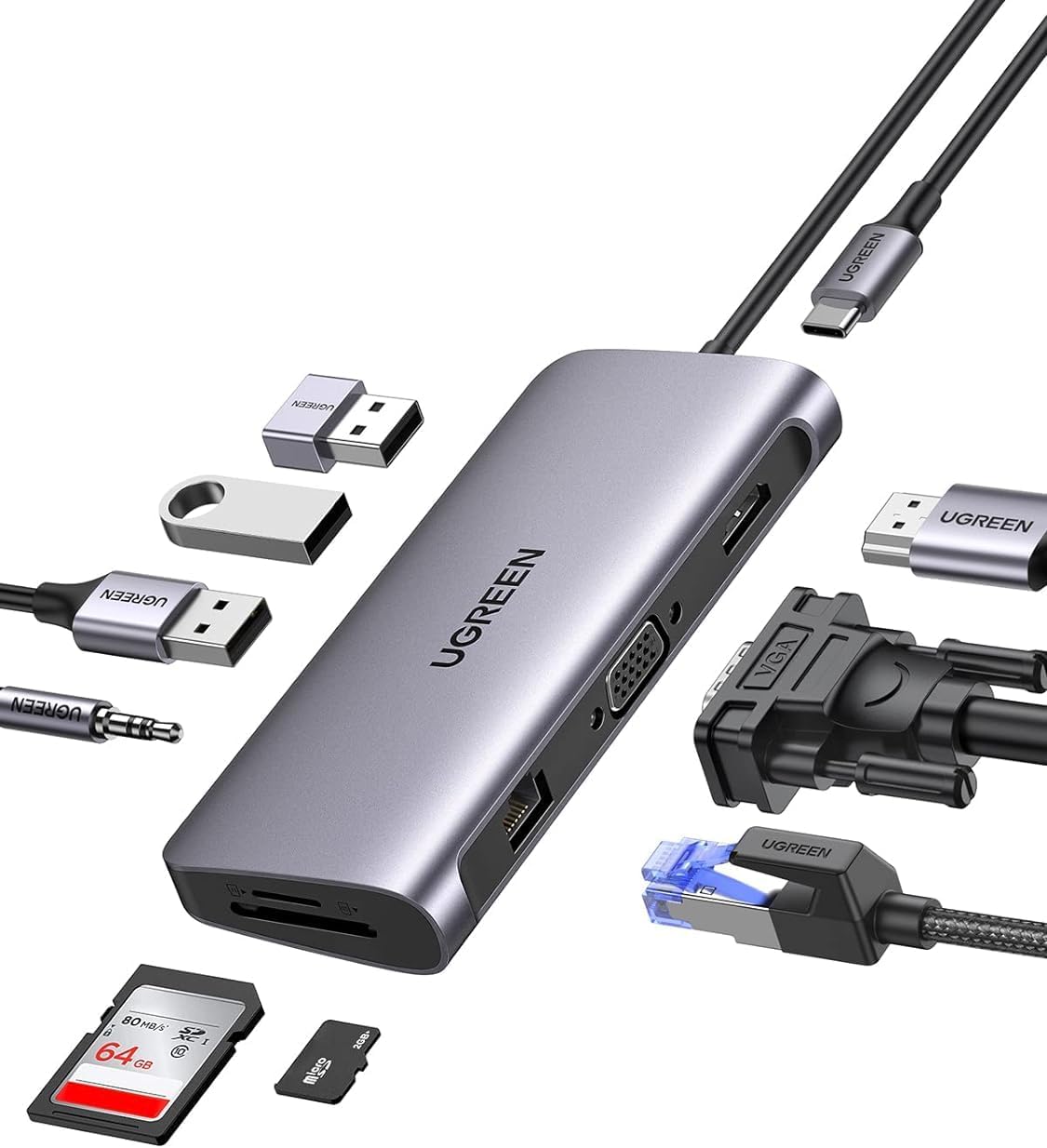 One Adapter= HDMI+ VGA+ Ethernet+ PD+ USB 3.0+ SD/TF+ 3.5mm Audio Jack