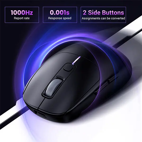 The ergonomic design ensures comfort during extended use. Side buttons simplify navigation: you can go forward and backward between pages with ease, boosting your productivity. Equipped with a rechargeable 700mAh battery, the mouse offers up to 14 hours with RGB lighting and 43 hours without. You are even allowed to charge and play at the same time using the Type-C cable enclosed. At just 85 grams, the lightweight design ensures deft handling and maneuverability in the Ugreen MU103. For a seamless and versatile computing experience, go for the Ugreen MU103.