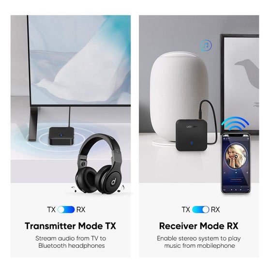 4. Turn the Bluetooth adapter to correct mode by switch the mode between TX and RX( TX in Sender mode for laptop, TV, RX in Receiver mode for Headphone, speaker)