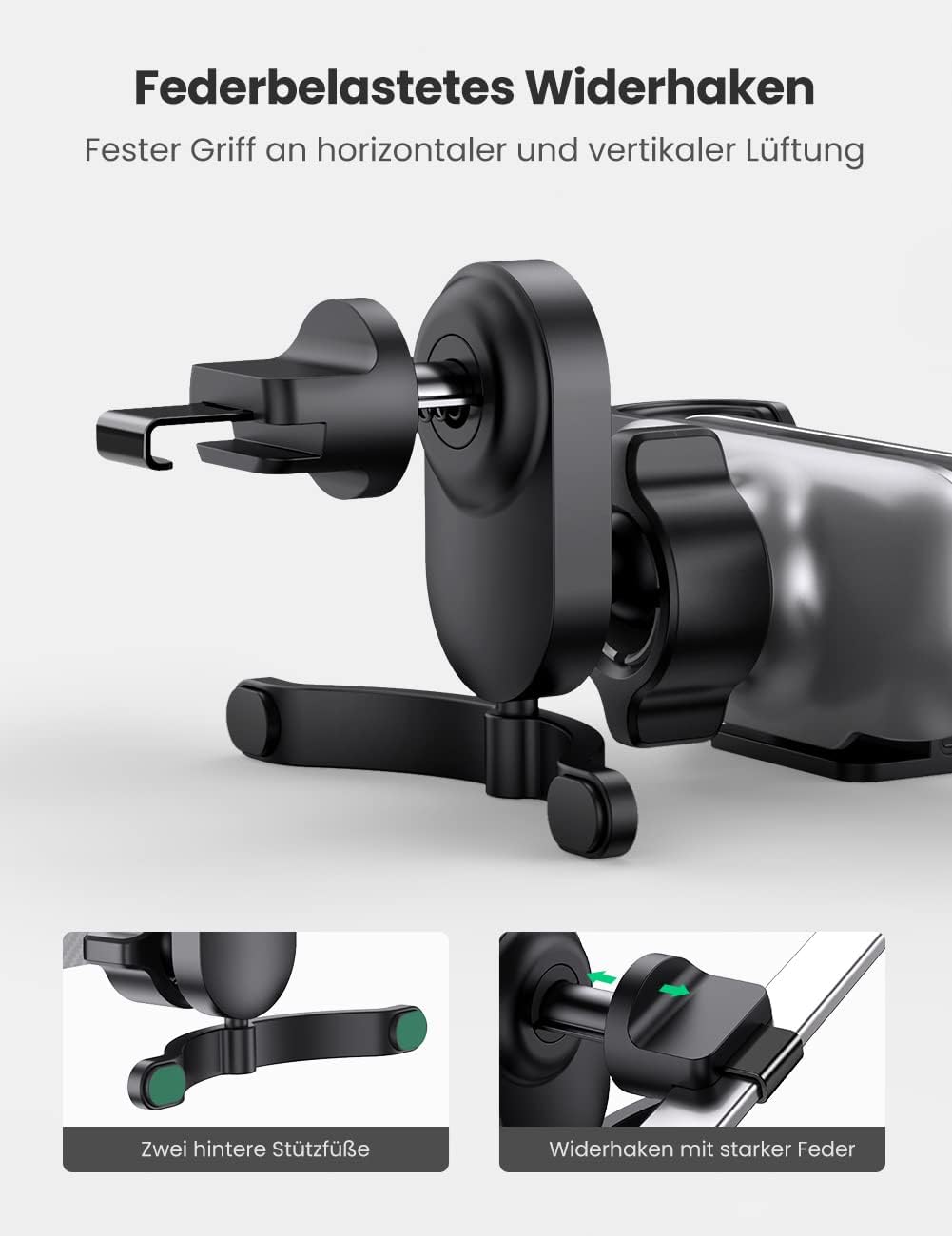 Durch ein längeres Haken mit Federmechanismus lässt sich der Handyhalter fürs Auto an mehreren Lamellentypen, ob horizontal oder vertikal, anpassen, jedoch ohne jegliche Einbüße an Griffigkeit.