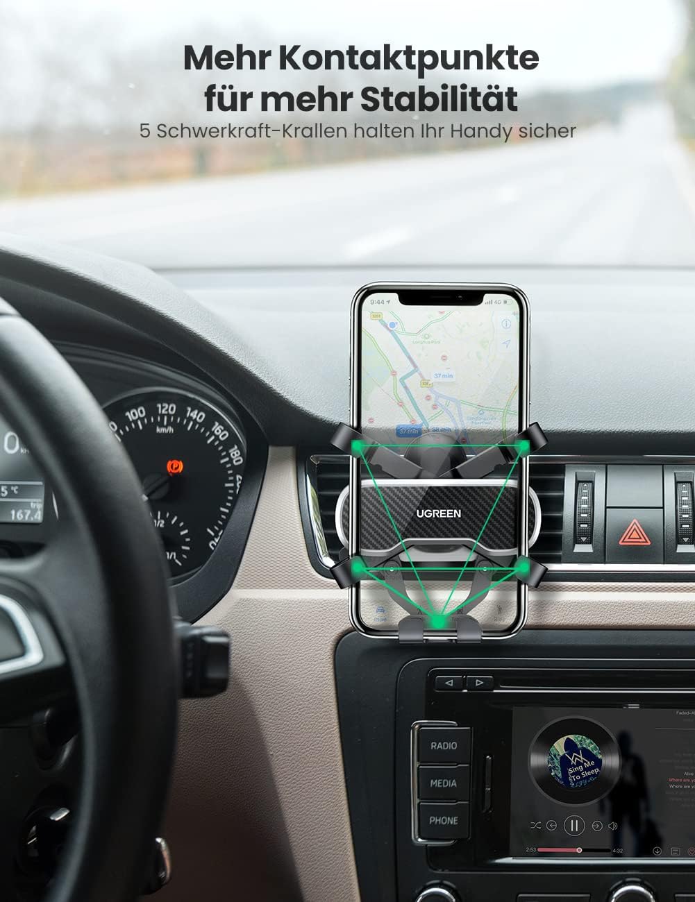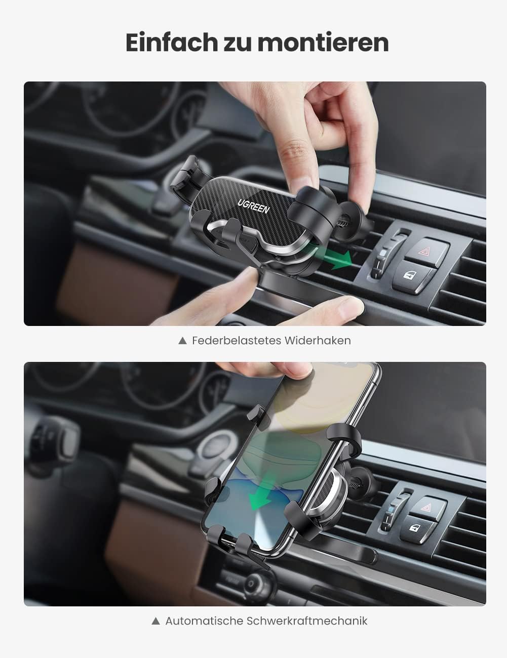 Wegen des kompakten und schlichten Designs dient UGREEN Autohalterung nicht nur als einen idealen Reisebegleiter sondern auch als eine unauffällige Zierde für Ihr Auto.