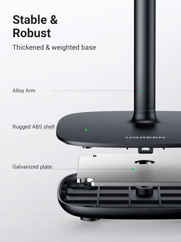 【Stable and Secure】: The phone stand features a weighted base and galvanized plate for added stability and security.
