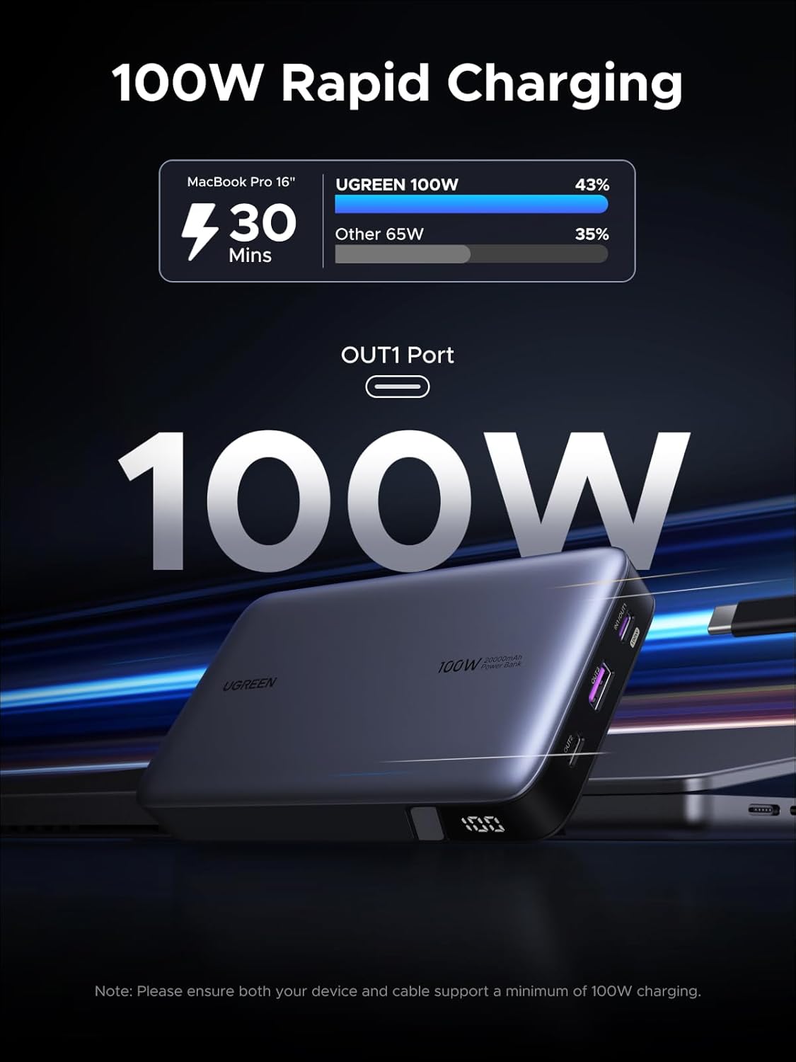 Tip: For charging laptops above 60W, please use the included USB-C to C cable (5A, 0.5 m/1.6 ft) for best performance. If you use another cable, make sure it supports 5A/100W output, otherwise the laptop may charge slowly or fail to charge.