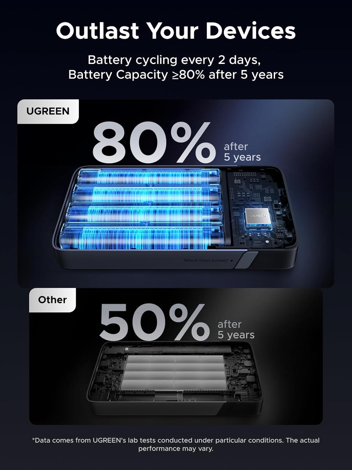 20000 mAh Huge Capacity: Ugreen usb c battery pack can meet 5-7 days of battery life, fully charge iPhone 15 Pro up to 4.5 times and MacBook Air 15” up to 1.1 times, ideal for traveling, business trips, camping, or other outdoor activities