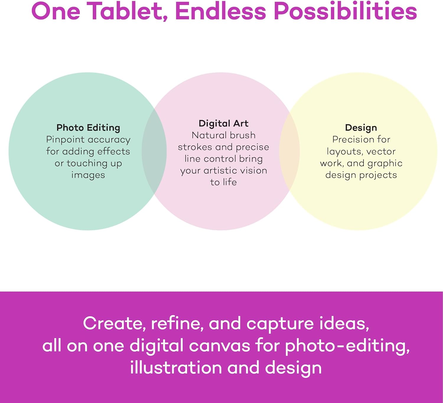 The tablet’s features include a dynamic built-in pen tray that stops the pen from rolling off the tablet and four customizable short-cut ExpressKeys™.