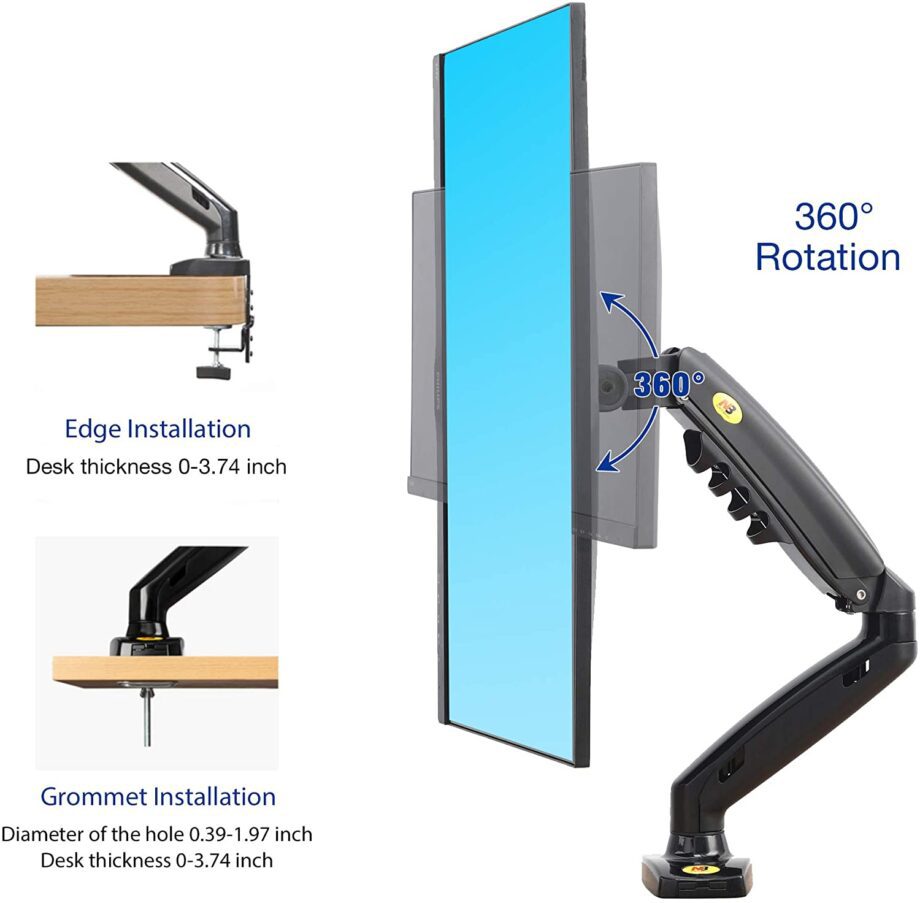 North Bayou monitor desk mount F80 is an ergonomics interactive display arm that allow you position your monitor wherever you need it so you can work in ergonomic comfort.It helps increase viewing comfort and reduce eye, back and neck strain.Height adjustable arm provide more work space, push away and free up table or desktop space when not in use.